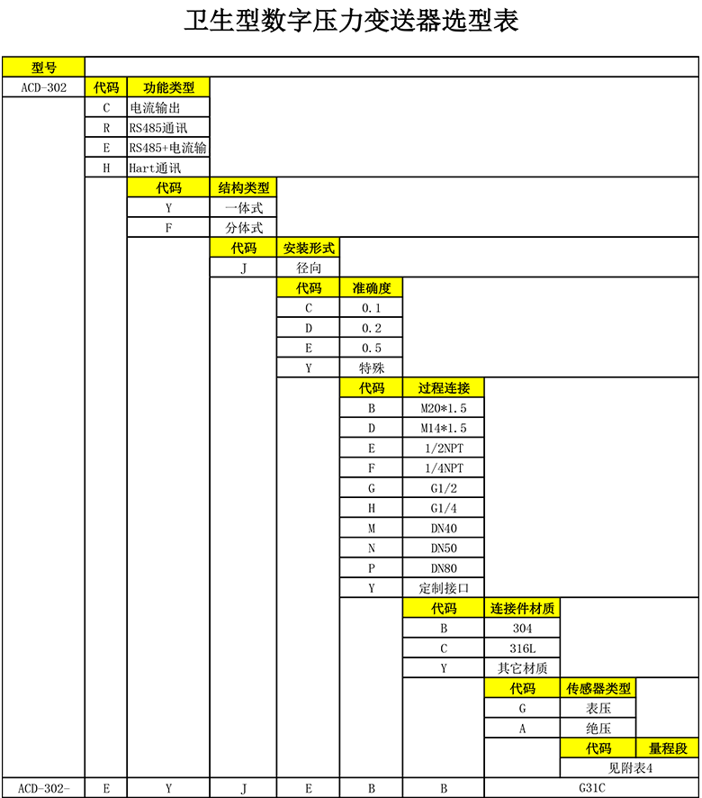 ACD-302压力变送器是一款专门为食品制药行业应用全新设计的卫生型压力仪表,仪表与过程介质接触部分全采用优质316L不锈钢及陶瓷材质结构,安装方式采用符合卫生标准的卡箍、快速便利接头等国际标准的过程连接安装接口,非常适合CIP/SIP原位清洗灭菌及外部喷水清洗操作,解决了结垢,堵塞,清洁卫生等问题,具有在工艺现场装拆快捷方便、不易污染、容易清洗、安全可靠的安全等优点。